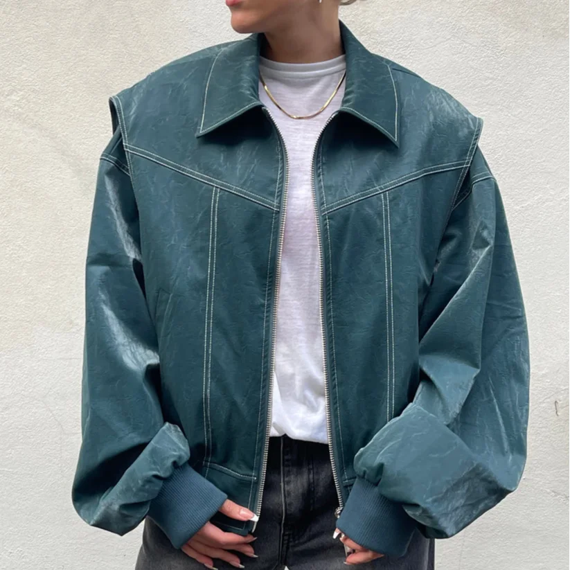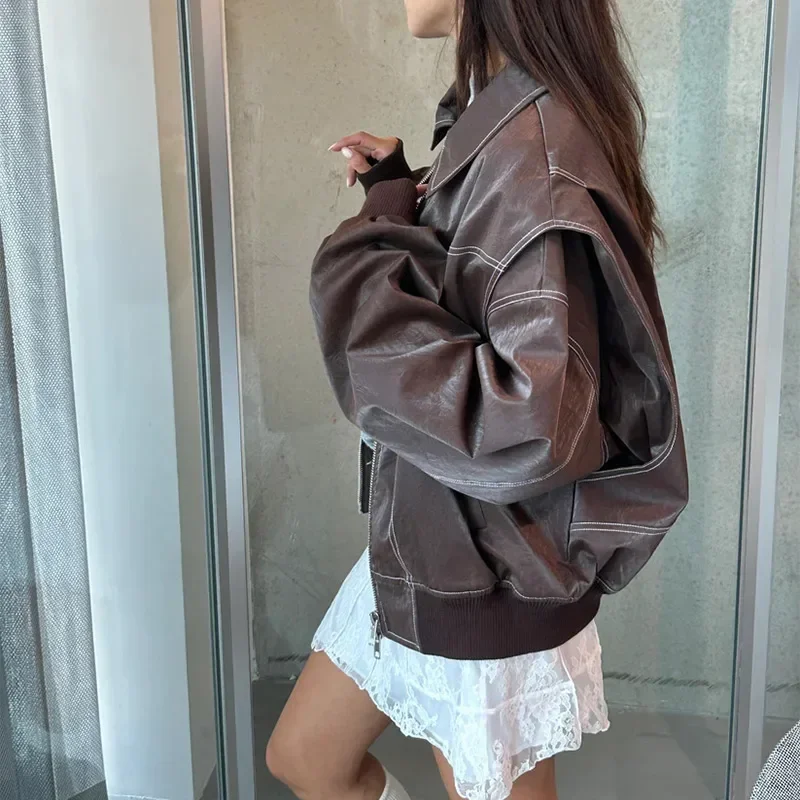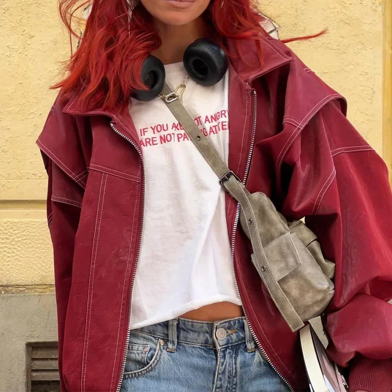 سترة جلدية بسحاب أحمر نبيذ للنساء ، أكمام طويلة غير رسمية ، معطف قصير بطية صدر ، ملابس خارجية عتيقة ، موضة الخريف
