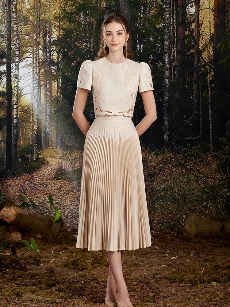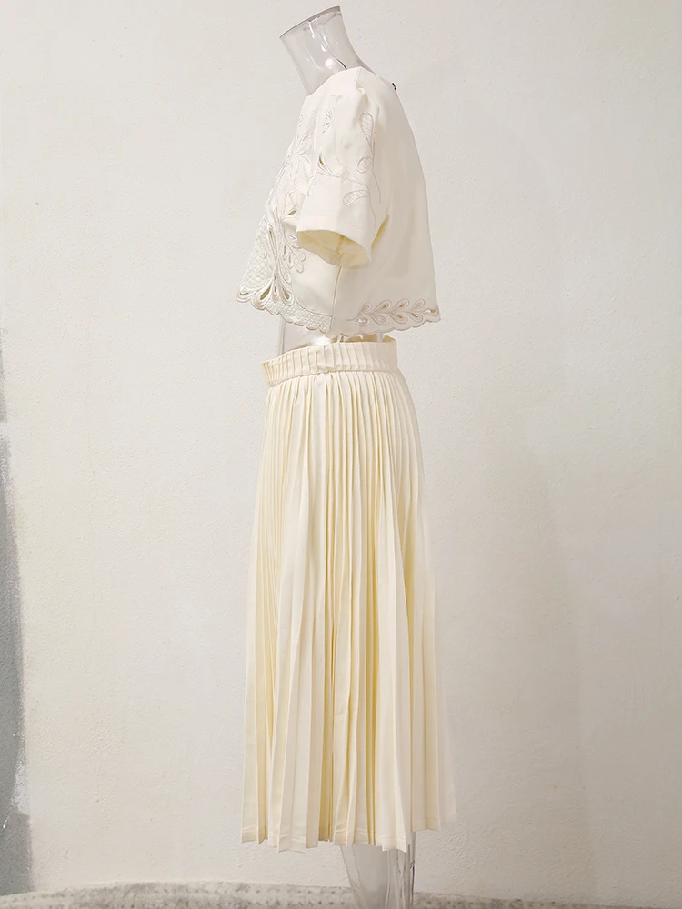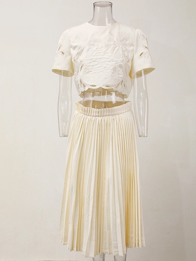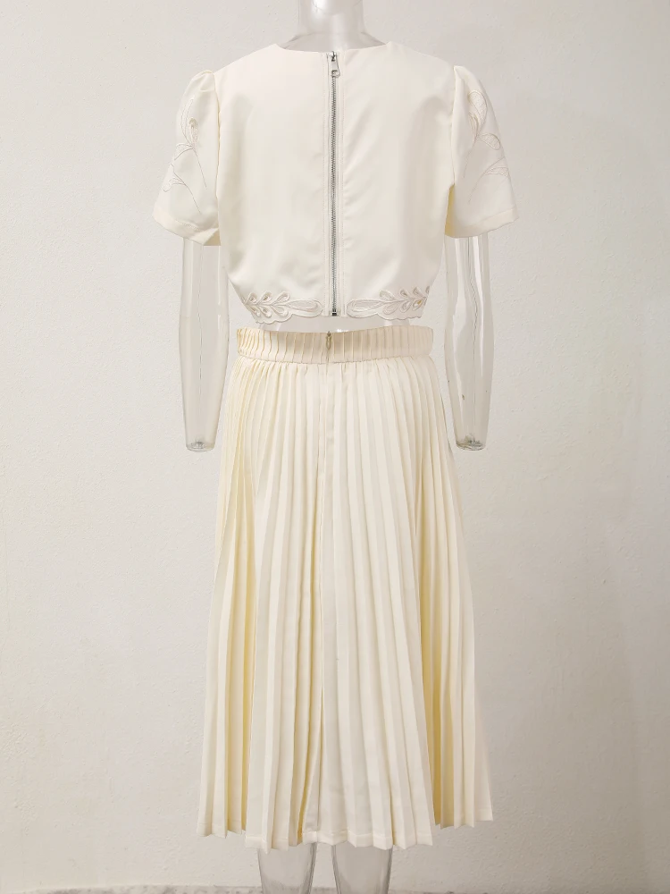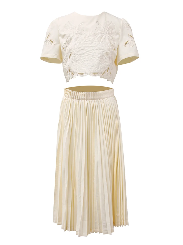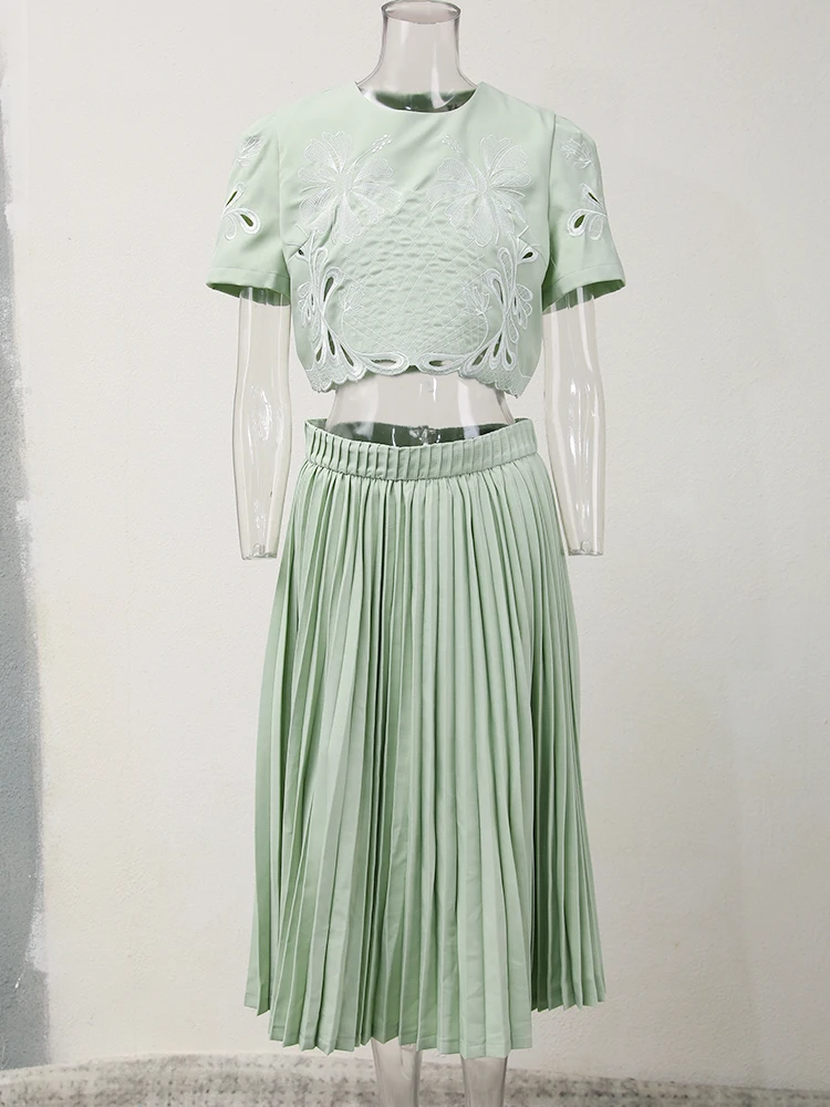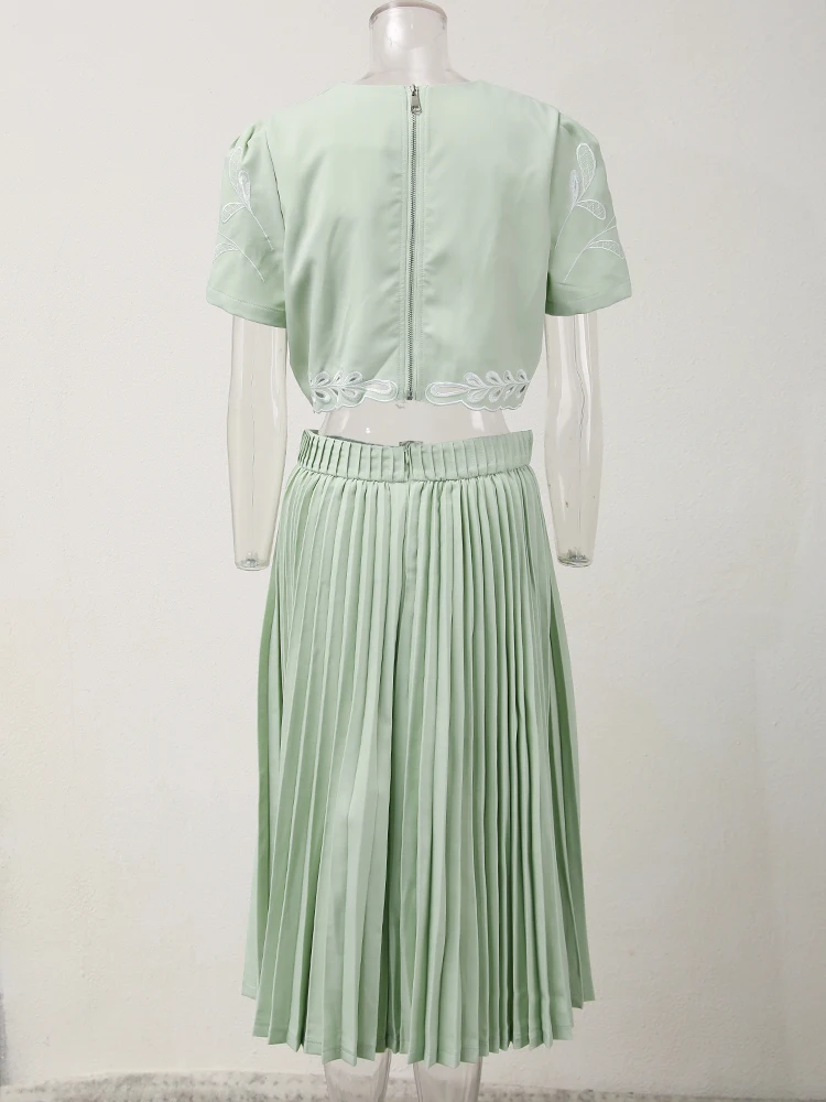 طقم من بلوزة قصيرة وتنورة للنساء ، طقم من جزئين ، قلادة مستديرة ، خصر مرن ، مطوي ، تنورة فضفاضة ، صيف ، جديد ، 13db7078