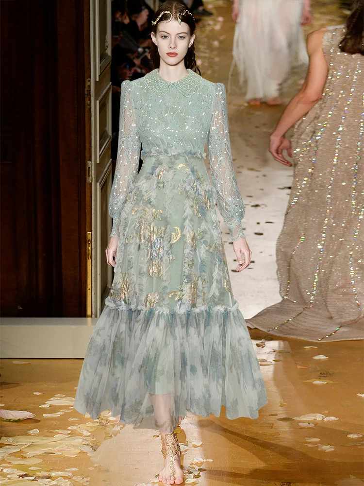 فستان طويل للسيدات لربيع وصيف مصمم على الموضة من Seasixiang مطرز بالخرز ترتر فانوس كم من الدانتيل مرقع من قماش الجاكار فستان عتيق