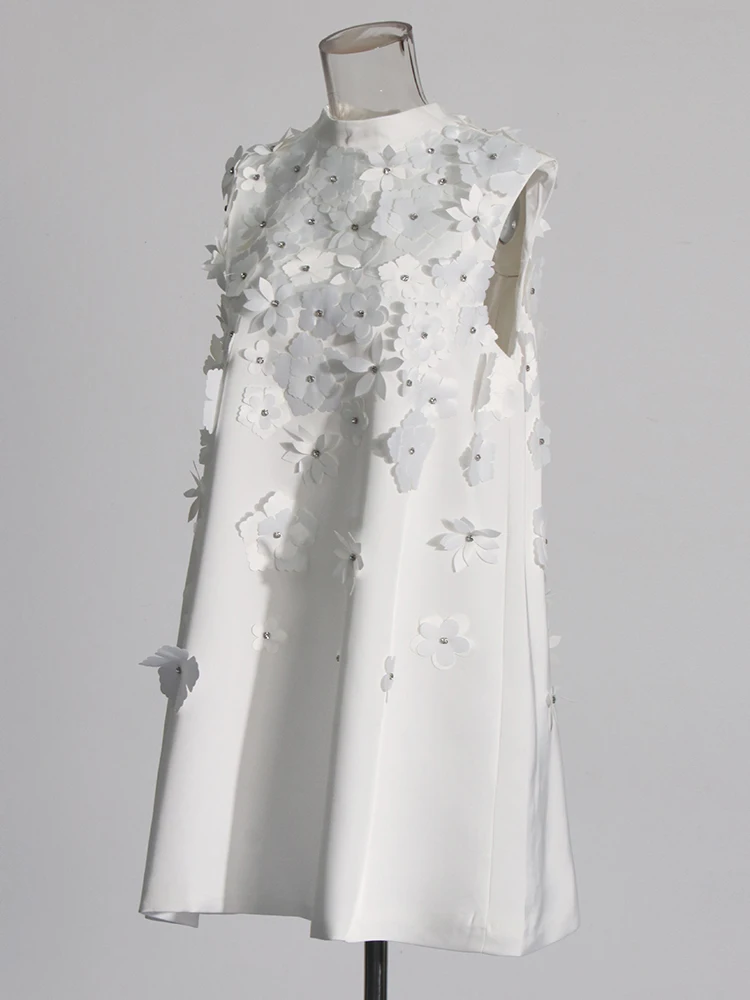 فستان قصير للنساء بدون أكمام على شكل حرف A ، مزخرف مزخرف ، فساتين فضفاضة صلبة أنيقة ، ياقة قائمة ، بلا أكمام ، قوس مرقع ، أنثى