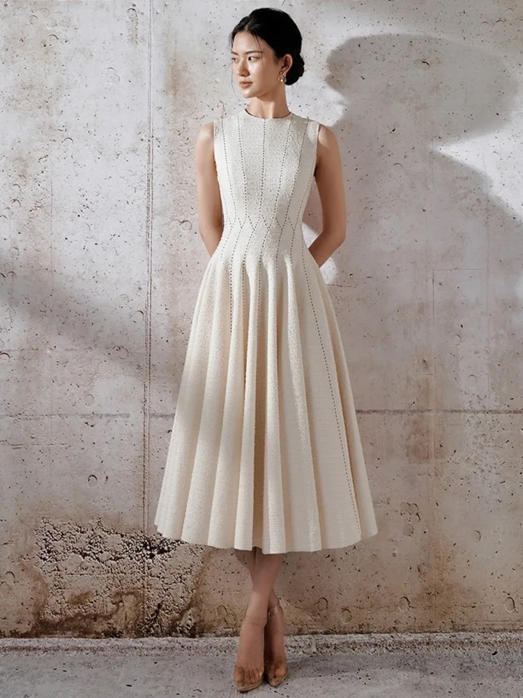فستان نسائي عالي الخصر بلا أكمام برقبة دائرية ، خطوط براقة ، فساتين أنيقة بطيات ، أحادي اللون ، موضة الربيع ، جديد ، 140db381
