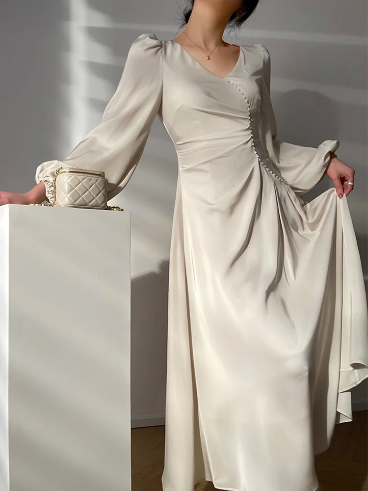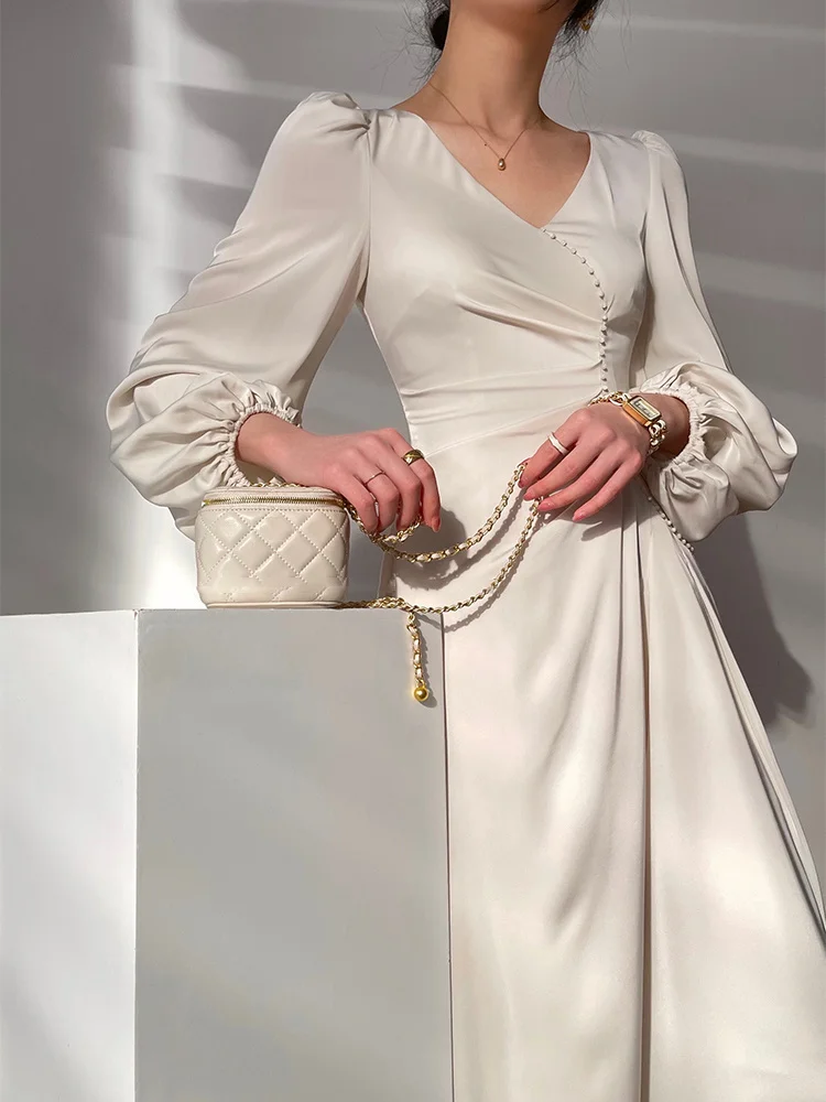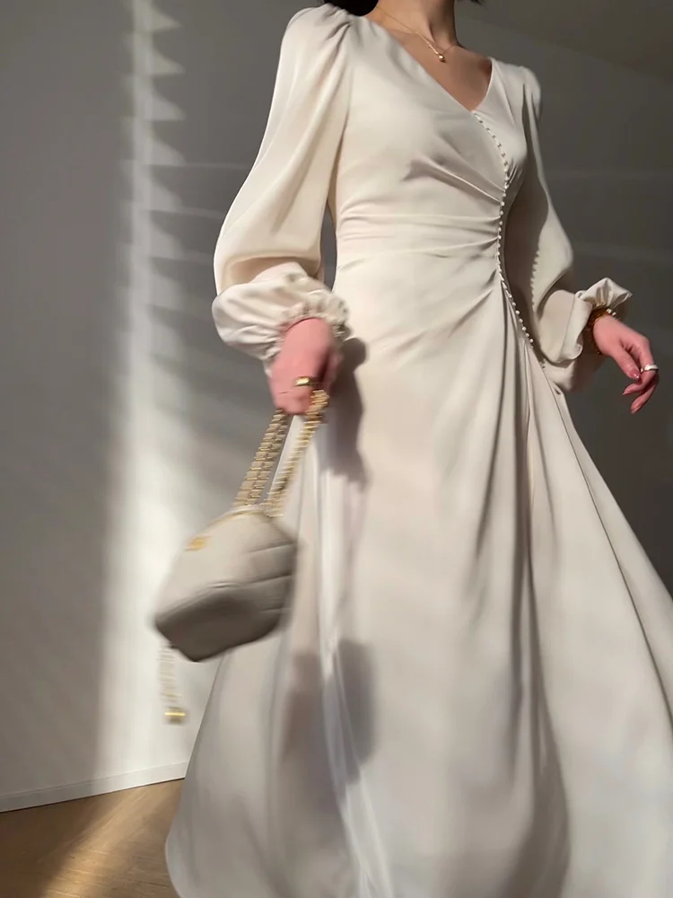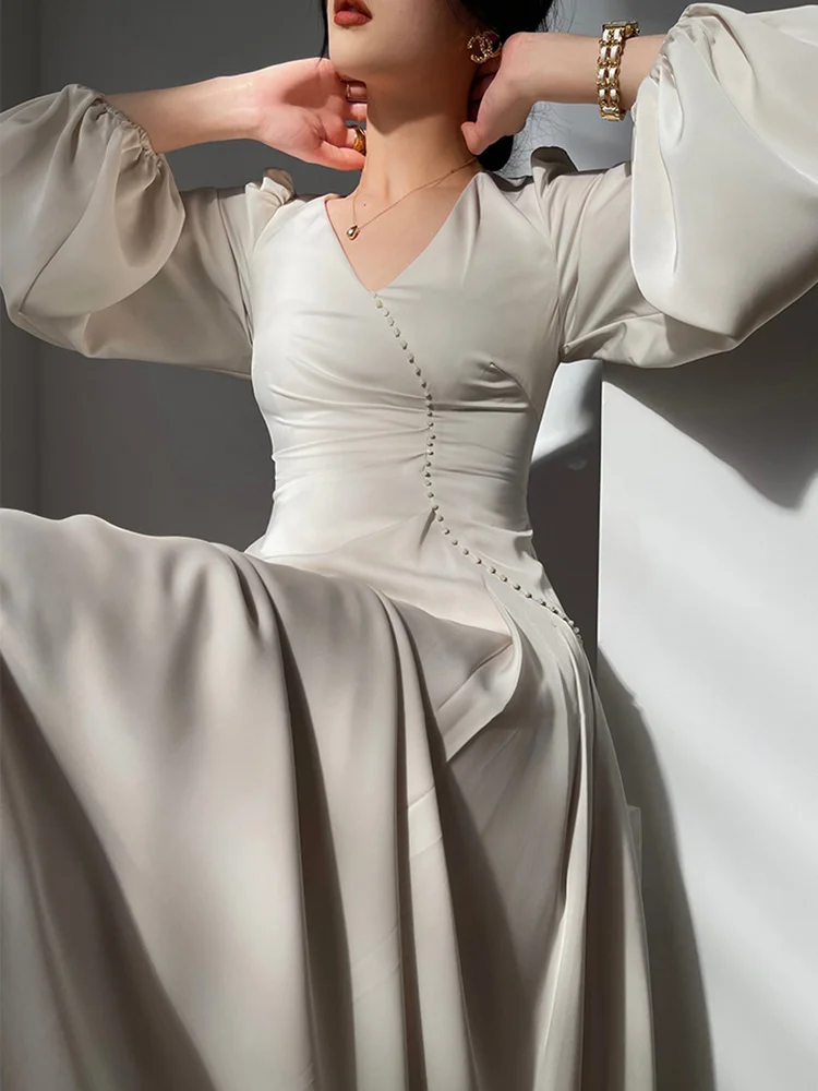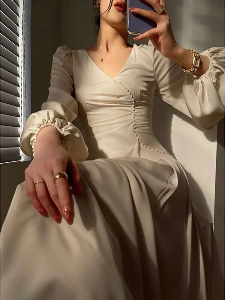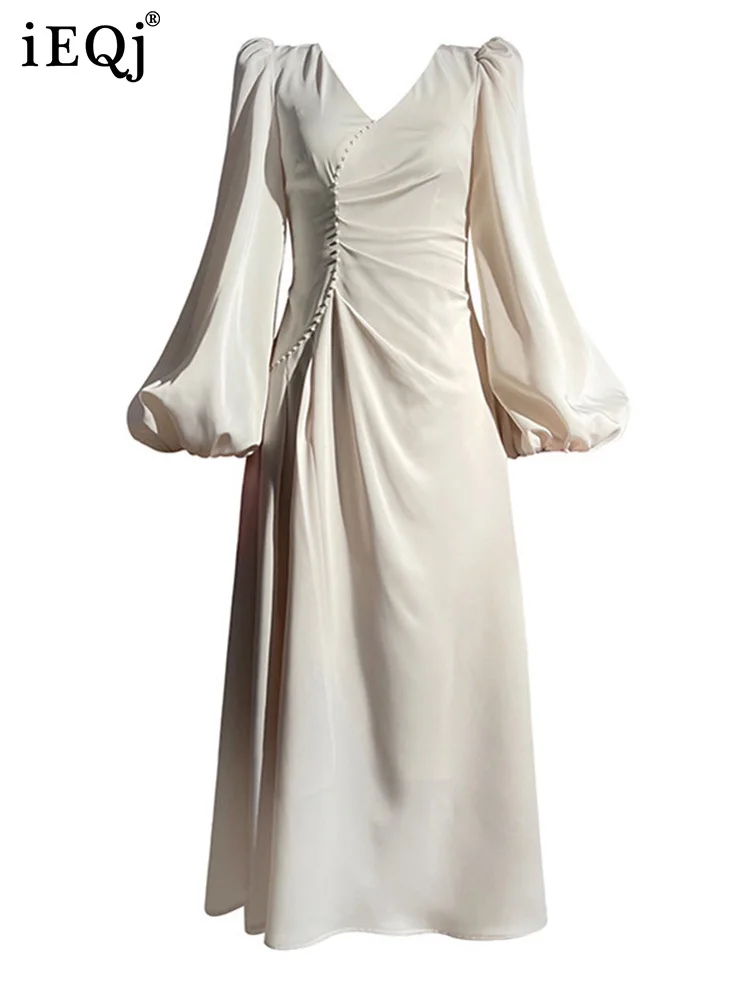فستان نسائي كلاسيكي فرنسي من IEQJ بأكمام طويلة وفتحة رقبة على شكل حرف v مطرز بألوان سادة فساتين نسائية موضة صيف 2023 جديد 3W1191