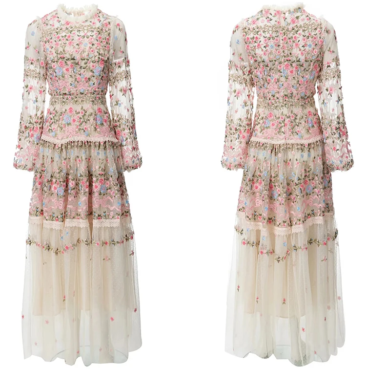 Seasixiang-فستان ماكسي شبكي عتيق بطول الأرض للنساء ، رقبة دائرية ، كم فانوس ، تطريز زهور ، موضة ، خريف ، حفلة