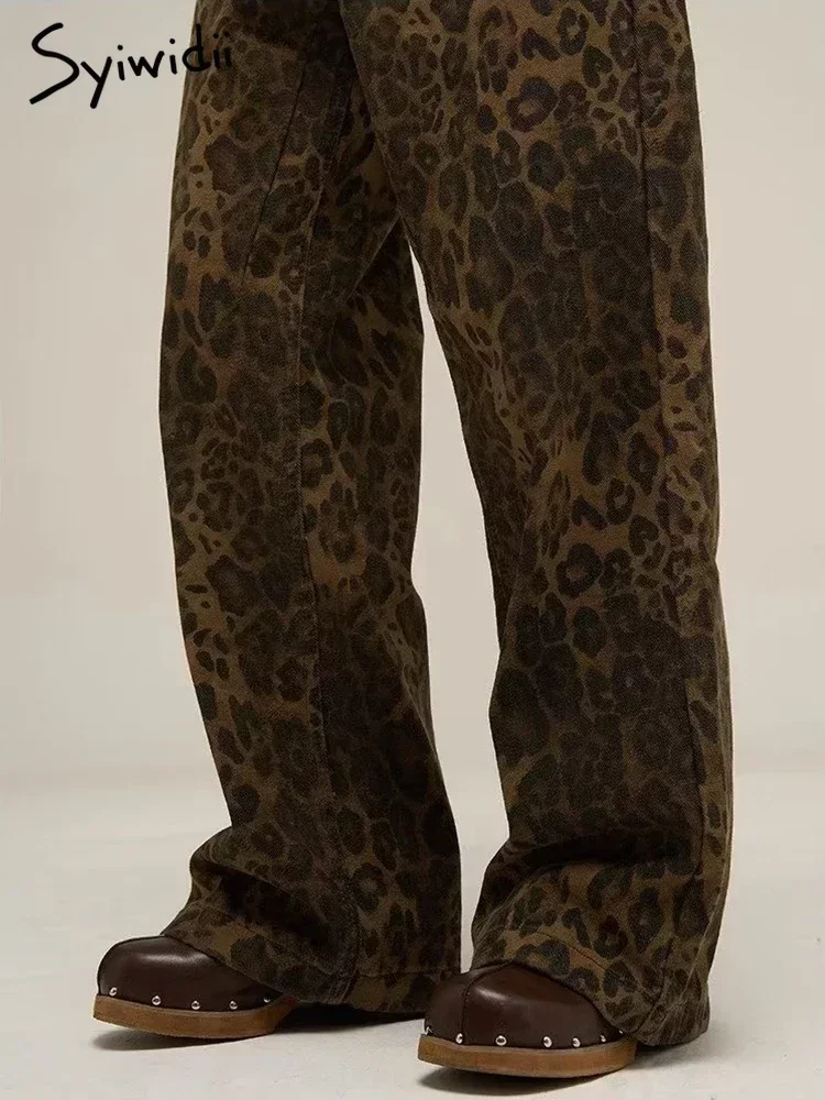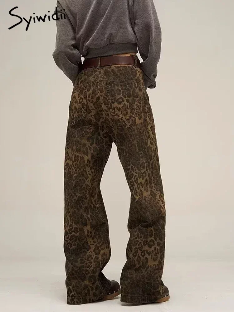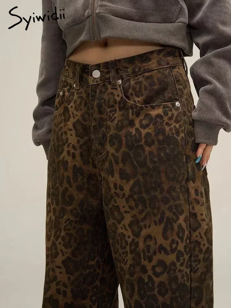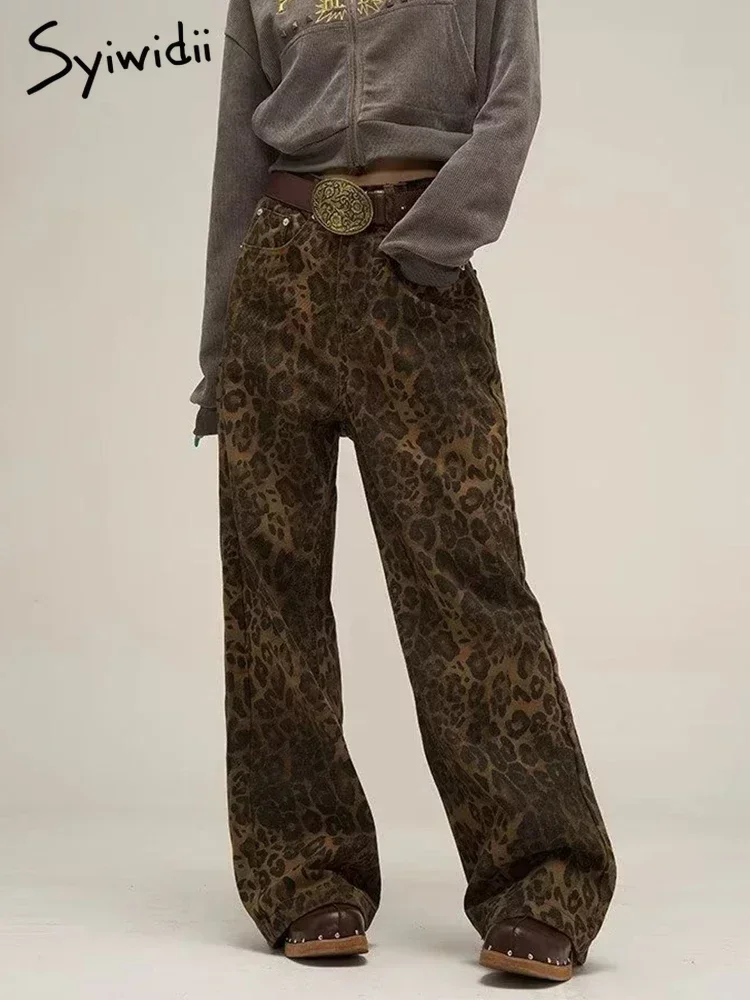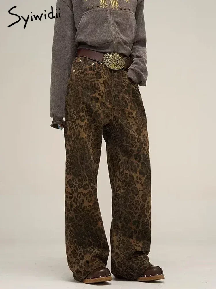 Syiwidii-جينز نسائي مطبوع عليه جلد الفهد ، بنطال جينز واسع الساق ، ملابس الشارع الشهير ، خمر ، فضفاض ، فضفاض ، مصمم ، هيب هوب ، Y2K