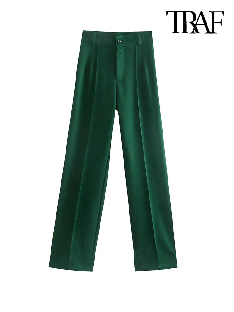 TRAF أزياء أنيقة للنساء مكتب ارتداء السراويل المستقيمة خمر عالية الخصر سستة يطير الإناث بنطلون Mujer